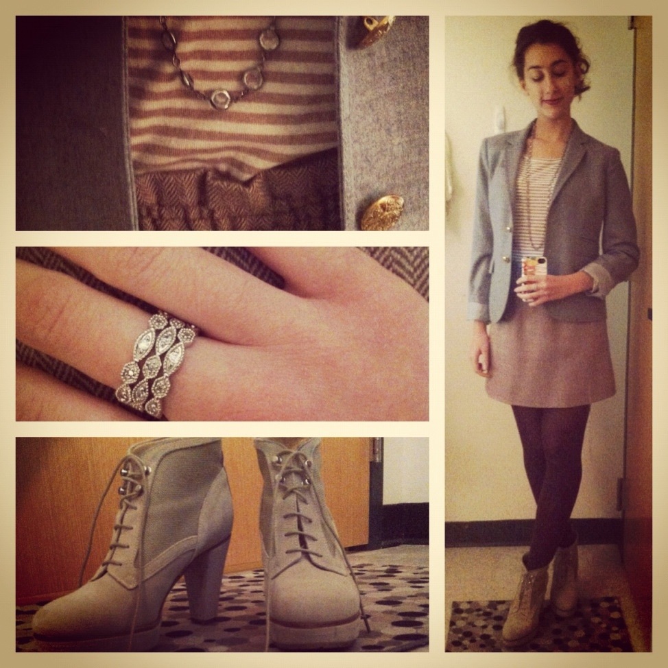 In terms of accessories, I am wearing a Mary Louise long crystal necklace. She has beautiful jewelry and this piece goes with any outfit. I love how it picks up the colors of the garment it is over. Many celebrities love Mary Louise designs, but who wouldn’t?! I am also wearing Stella & Dot stackable rings that give off the perfect amount of sparkle. My booties are from Rag & Bone–another company I think is fabulous! These are very easy to walk in and provide good traction making it less likely to slip when walking to class.