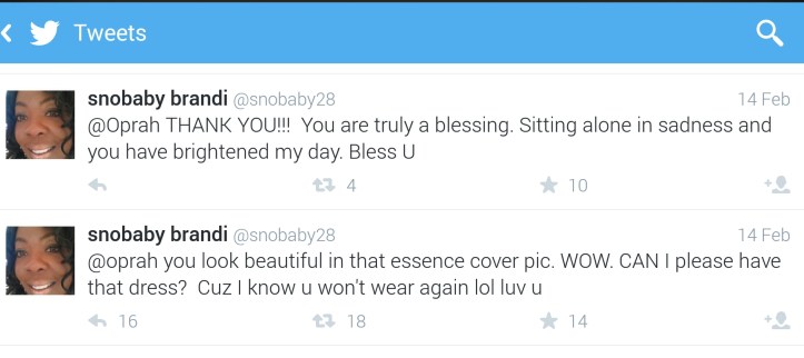 March 8, 2014March 8, 2014Outersparkle wpid-Screenshot_2014-03-08-09-15-55_1.jpg Twitter Fan Brandi asks Oprah for her dress Share this:Tweet Click to share on Reddit (Opens in new window) Reddit PocketShare on Tumblr Click to email a link to a friend (Opens in new window) Email Click to print (Opens in new window) Print More Click to share on Telegram (Opens in new window) Telegram Click to share on WhatsApp (Opens in new window) WhatsApp Like Loading...