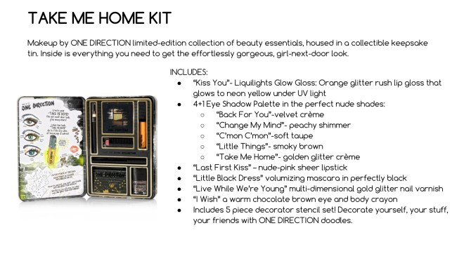 Hey there 1D fans, back in August did a giveaway for the Makeup by 1D makeup kit and concert. So now its time for me to review one of the three kits available in stores. My kit was the “Take Me Home” kit, watch my youtube video below as I open and and apply the contents in the kit. My favorite items from the kit is the 4 in 1 eye-shadow palette, which has nude shades, that can be worn daily since I’m not a fan of eye makeup. In all, the kit has a nice selection of items and reasonably priced for its contents. I did pass down the kit to my 15 year old niece, which she had zero complaints and it was a hit with her friends too.