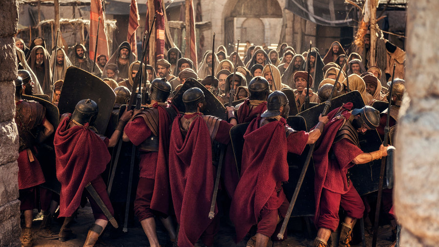 After examining the tomb himself, Thomas returns to the safe house to tell the others the Temple guards are re-sealing the tomb to pretend Jesus’ body remains inside. Thomas, however, remains doubtful that Jesus has risen. Suddenly a voice calls out Thomas’ name from behind him, and he turns to see Jesus with his palms upward, showing his crucifixion wounds. In shock, Thomas drops to his knees and lowers his head in shame of doubting his Lord. “Blessed are they who have not seen me, and still believe,” Jesus tells him, and disappears once again. As Mother Mary and Mary Magdalene are downstairs, the door is kicked down and Roman soldiers flood the room. In an instant, the disciples depart the safe house with the Romans right on their heels. The Romans chase the disciples through the city, and they are forced to split up. Peter orders Thomas to hurry to the city gate, where he will meet him and the others. Suddenly Boaz grabs Peter and darts down a dark, narrow alley, offering some temporary safety. Peter explains his plan to escape to Galilee, and Boaz volunteers his help. They make their way to the closed-off city gate, where the others are waiting for Peter. Boaz and his freedom fighters hurl stones and firebombs at the Roman soldiers, who are forced to disperse. The disciples sneak out of the gate unnoticed in the midst of the mayhem. Cornelius reports back to Pilate, telling him the Nazarene’s men did not escape with the corpse, but it’s not at the hideout either. Pilate has had enough. “We are Rome,” he says with conviction. “It’s time we shut this story down.”