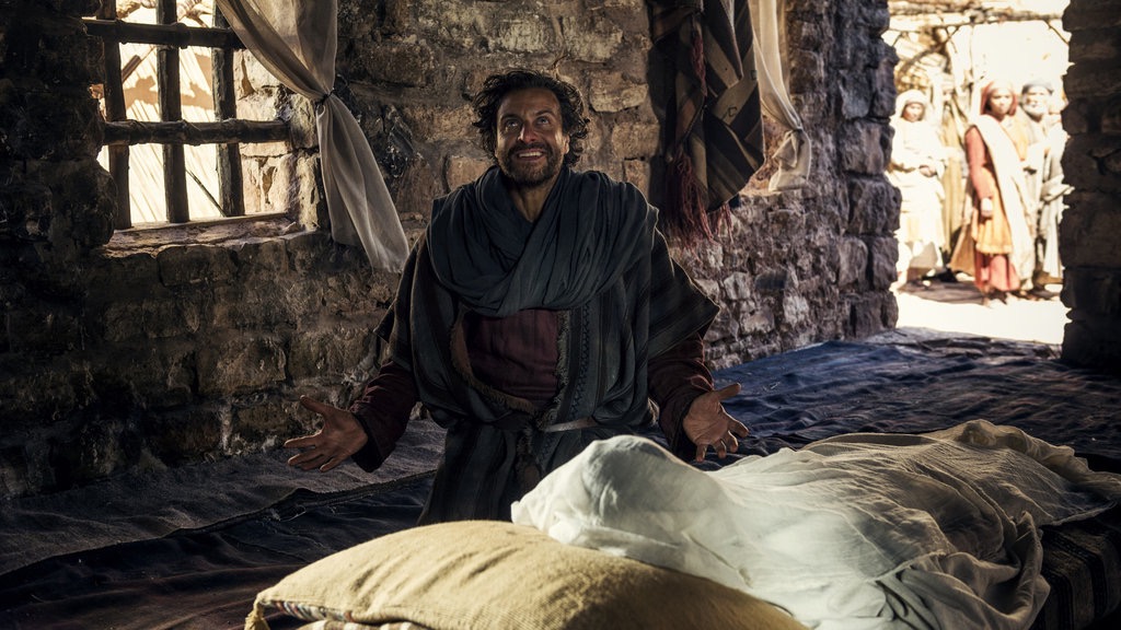 While preaching in a small Judean village, Peter is amazed to encounter Philip, who was on his way back to Jerusalem. Only Philip notices the Angel, who has come to deliver a message: they are to go south to the Gaza road. After dispatching Philip, Peter continues on his way to Joppa, where Mary has brought Tabitha. But by the time Peter arrives, Tabitha has died, devastating her family and Mary Magdalene. Peter finds her crying on the street – she thought her faith would be enough to keep Tabitha from dying. Peter tells her she’s not responsible for Tabitha’s death; it was God’s will. Mary takes him to Tabitha and leaves him alone to pray over the corpse. Moments later, Peter is besieged by a mighty wind, which blows Tabitha’s shroud away. Peter commands Tabitha to “get up!” and she does, restored to life. Mary brings them outside where they’re embraced by a joyous crowd.