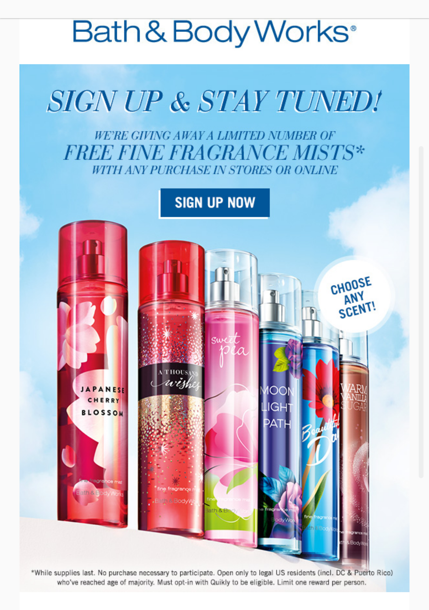 So if your like me than, your totally gonna love getting a Free Bath & Bodyworks Fragrance Mist just by signing up on their mailing list! My two new favorite fragrances are Hello Beautiful and Malibu Heat. All you have to do is click on the link below: